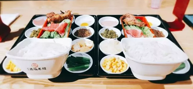 先放入不易熟的配料,然后就這么依次、小心翼翼地把小碟子里的食物搬空,最 后放入一碗Q彈的米線,靜靜等待十秒左右,這鍋你期待已久的美味過橋米線就可以開吃啦!