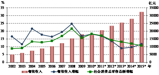 全國餐飲收入及增速狀況(2002~2015年)
