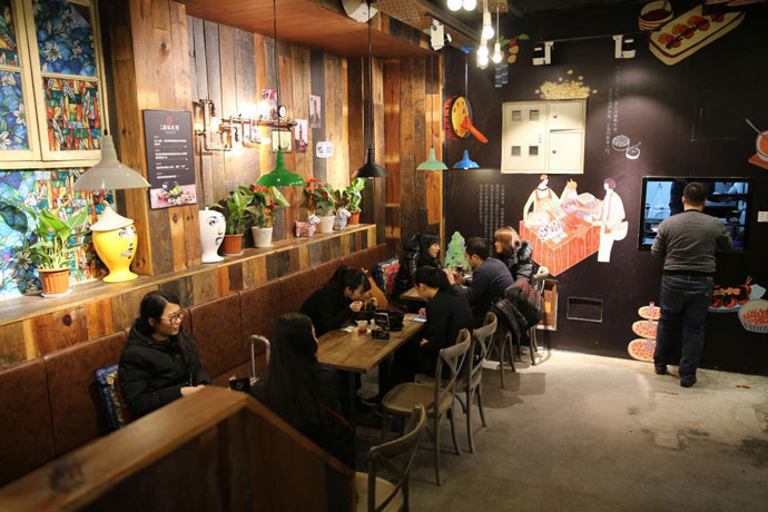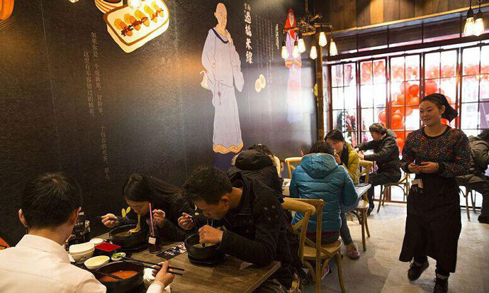 5、“十秒到云南過橋米線”店面裝潢極具民族設計感,契合云南這一民族特色,從民族壁畫、云南彩燈到店小二服飾等細節都極具云南民族風情,首先給消費者以視覺上的沖擊,可以說是從味覺到視覺全方位為消費者帶來純正的云南風味。