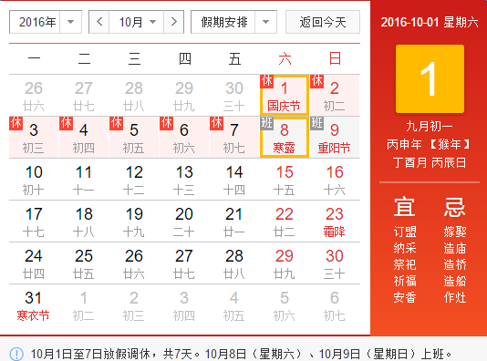 10月1日至7日放假調(diào)休,共7天。10月8日(星期六)、10月9日(星期天)上班。